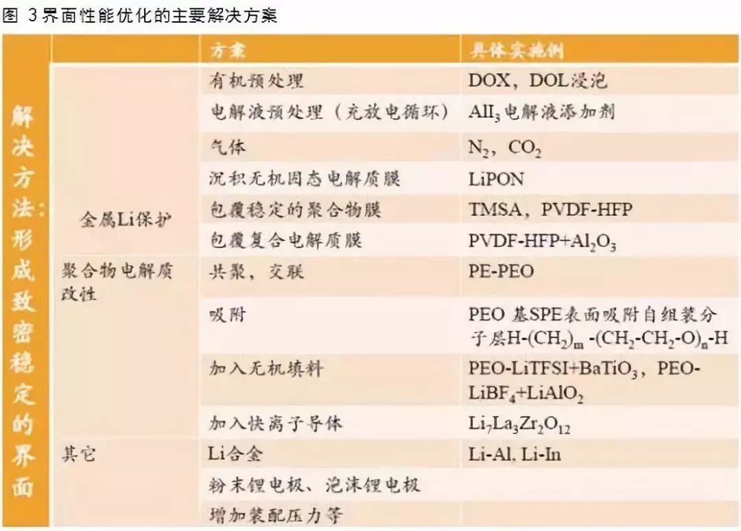 固體電解質(zhì)存在與電*間界面阻抗大,界面相容性較差,同時充放電過程中各材料的體積膨脹和收縮,導(dǎo)致界面容易分離等問題。使用鋰金屬負*也存在固相接觸阻抗大,界面反應(yīng),效率低等問題。目前解決的主要方向如下: